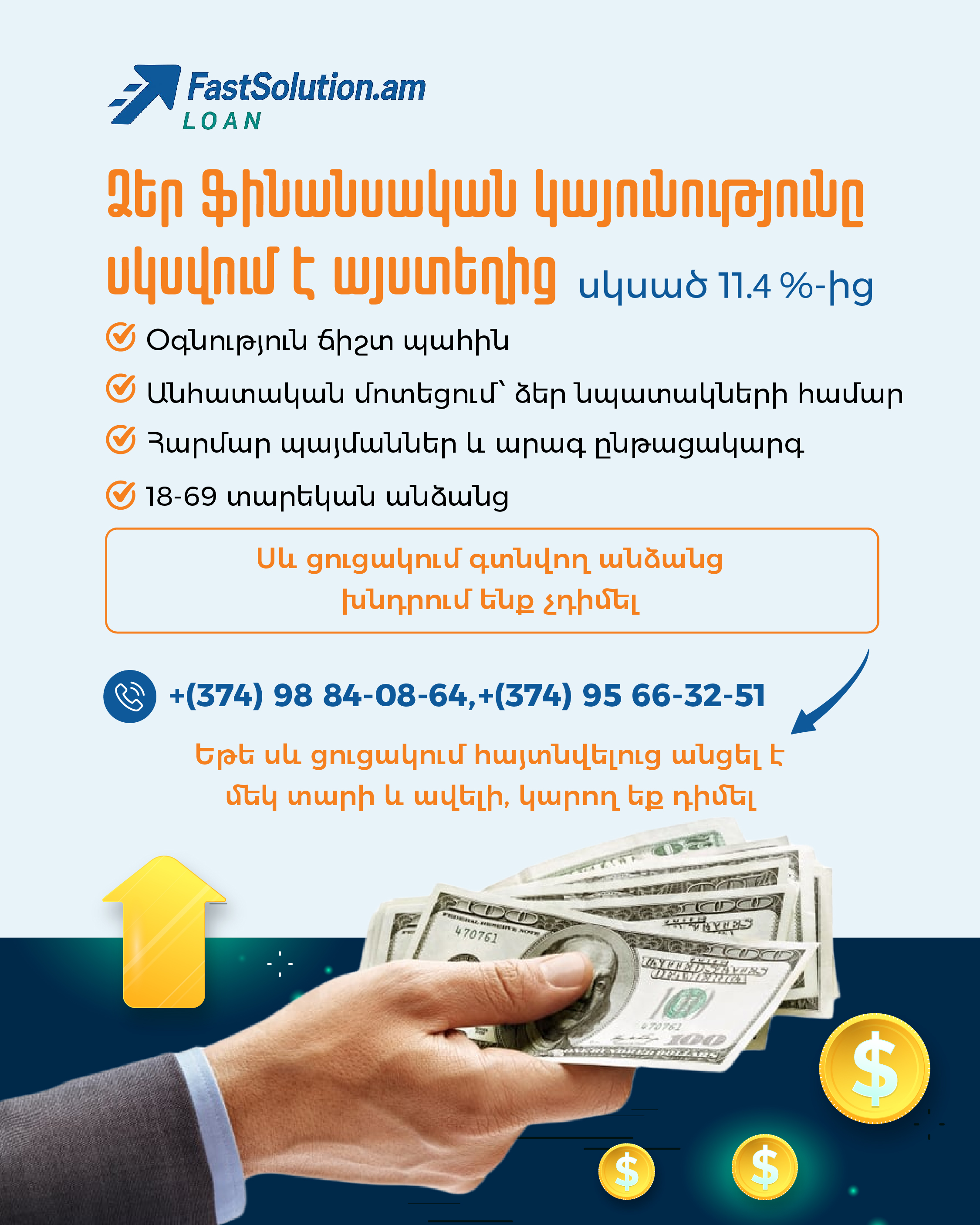 Մենք առաջարկում ենք ամենաարդյունավետ լուծումները՝ վարկային պահանջները ճշգրիտ գնահատելու և արագ հաստատվելու համար։ Մեր փորձառու մասնագետներն ապահովում են լավագույն իրականացում՝ Ձեր ֆինանսական նպատակի համար։